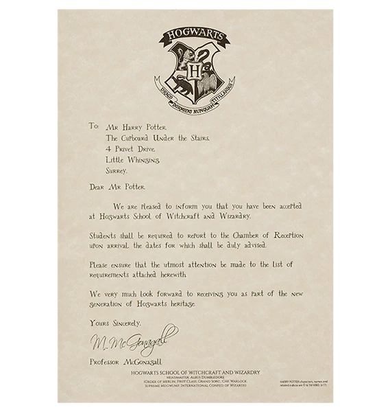 Your Hogwarts Acceptance Letter will arrive addressed specifically to the lucky individual, printed in the same shade of green as Harry Potter's own Acceptance Letter, inside an exclusive Hogwarts Presentation Wallet. The letter features the Hogwarts School of Witchcraft and Wizardry crest and is signed by Professor McGonagall, Professor at Hogwarts and Head of the Gryffindor House.